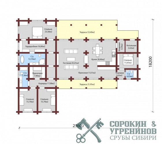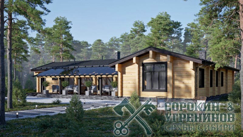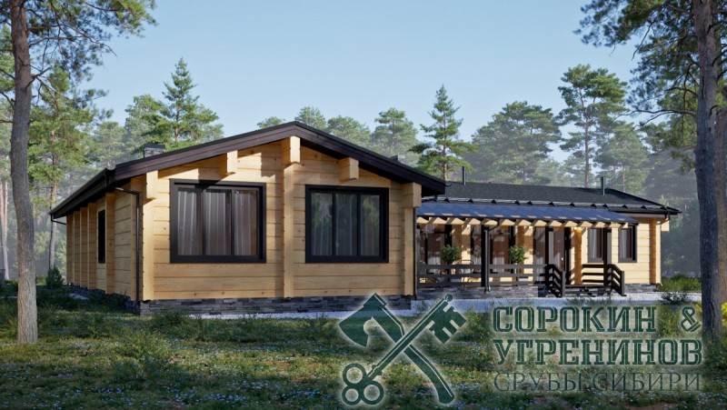 Индивидуальный проект одноэтажного жилого дома из лафета сечением 250х400мм. Общая площадь дома 305м2. Большой дом имеет т-образную форму, и два выхода на террасы, четыре спальные комнаты, три санузла, гардеробная, котельная, большая гостиная с камином, прачечная, кладовая.